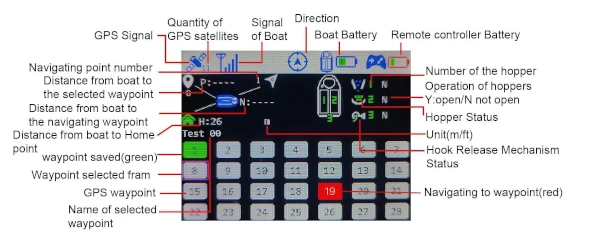 De GPS bedien je gemakkelijk met je afstandsbediening. Nadat je de voerboot hebt gekalibreerd en je Home Point aan hebt gemaakt kun je vervolgens 28 visplaatsen vastleggen. Alle informatie is dan zichtbaar op de afstandsbediening, de afstand in meters tussen het thuispunt en elk waypoint. De GPS zal de boot precies laten doen wat u wilt, bijvoorbeeld naar waypoint 1 om voer en haakaas montage te lossen om daarna terug te gaan naar het Home Point. Bij het uitvallen van de zender komt de karper voerboot ook automatisch terug naar zijn Home Point